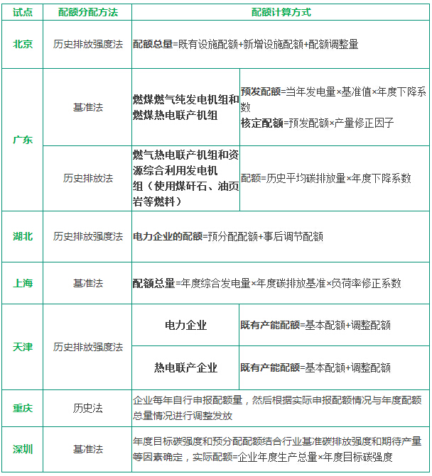 根据目前试点的情况来看,电力行业的配额分配方式主要分为历史排放强度法和基准法。
